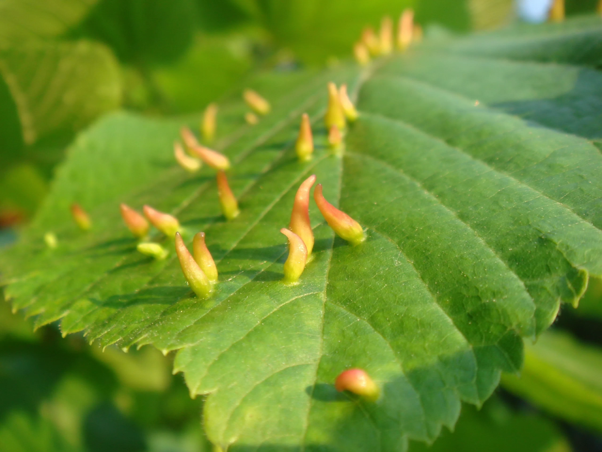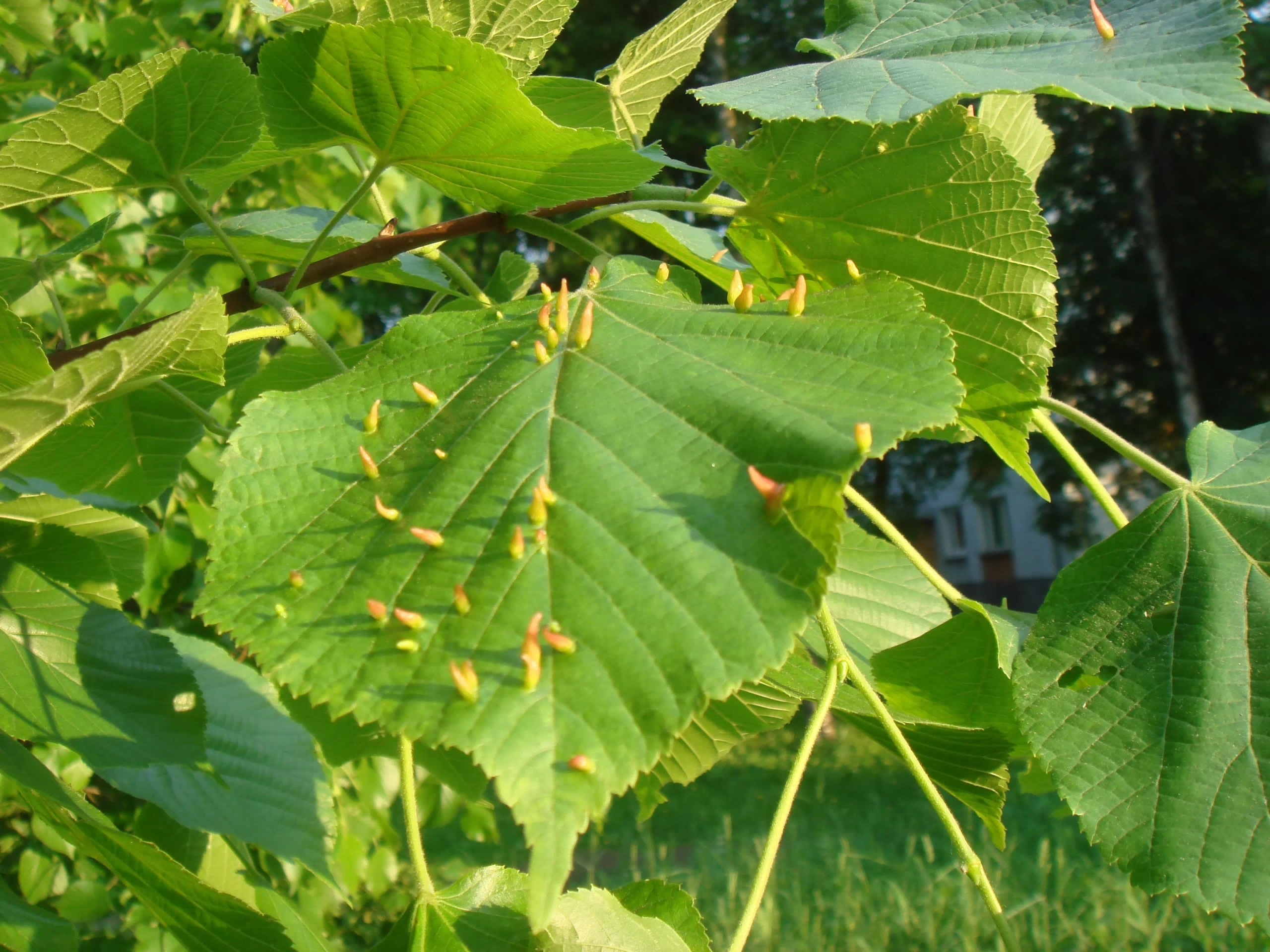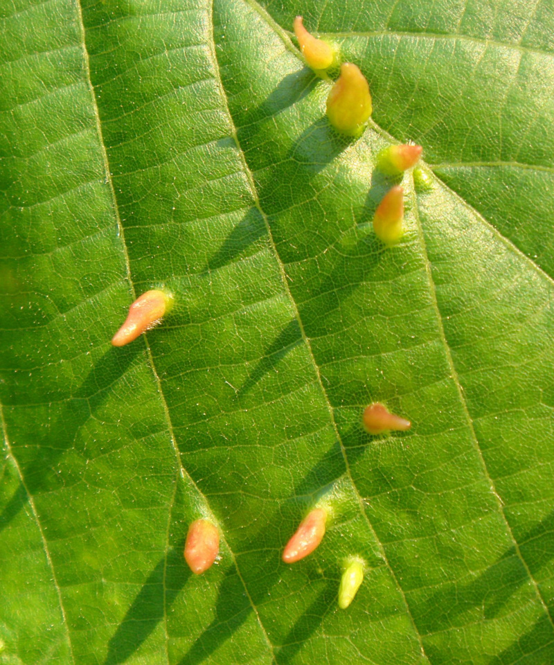 Стручковидные оранжевые галлы на листьях - Eriophyes tiliae